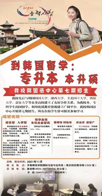 报名地点:红足一1世66814韩国语中心(章丘校区二号教学楼C223室)咨询电话:0531-66778373;15853163177(微信同号)。