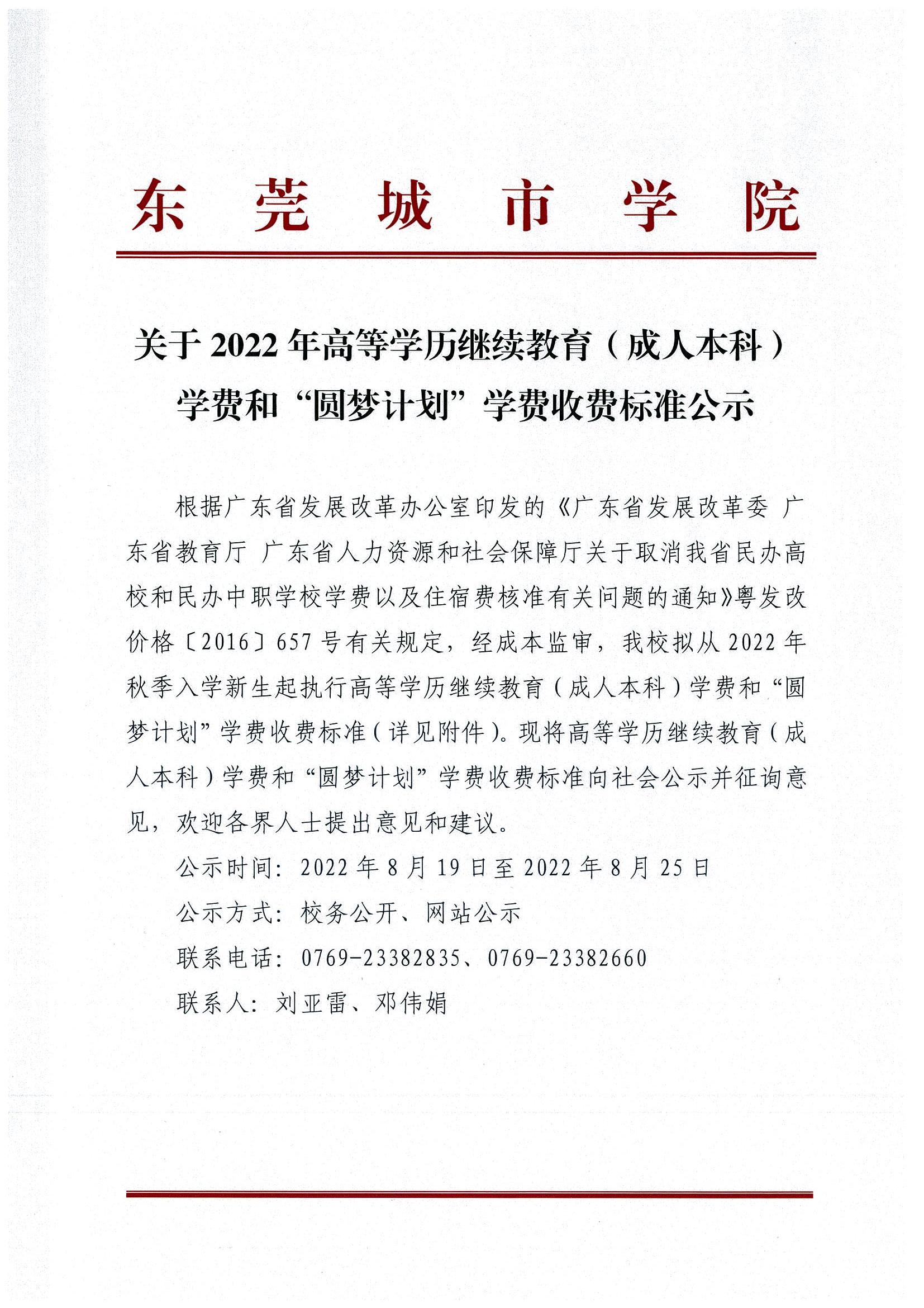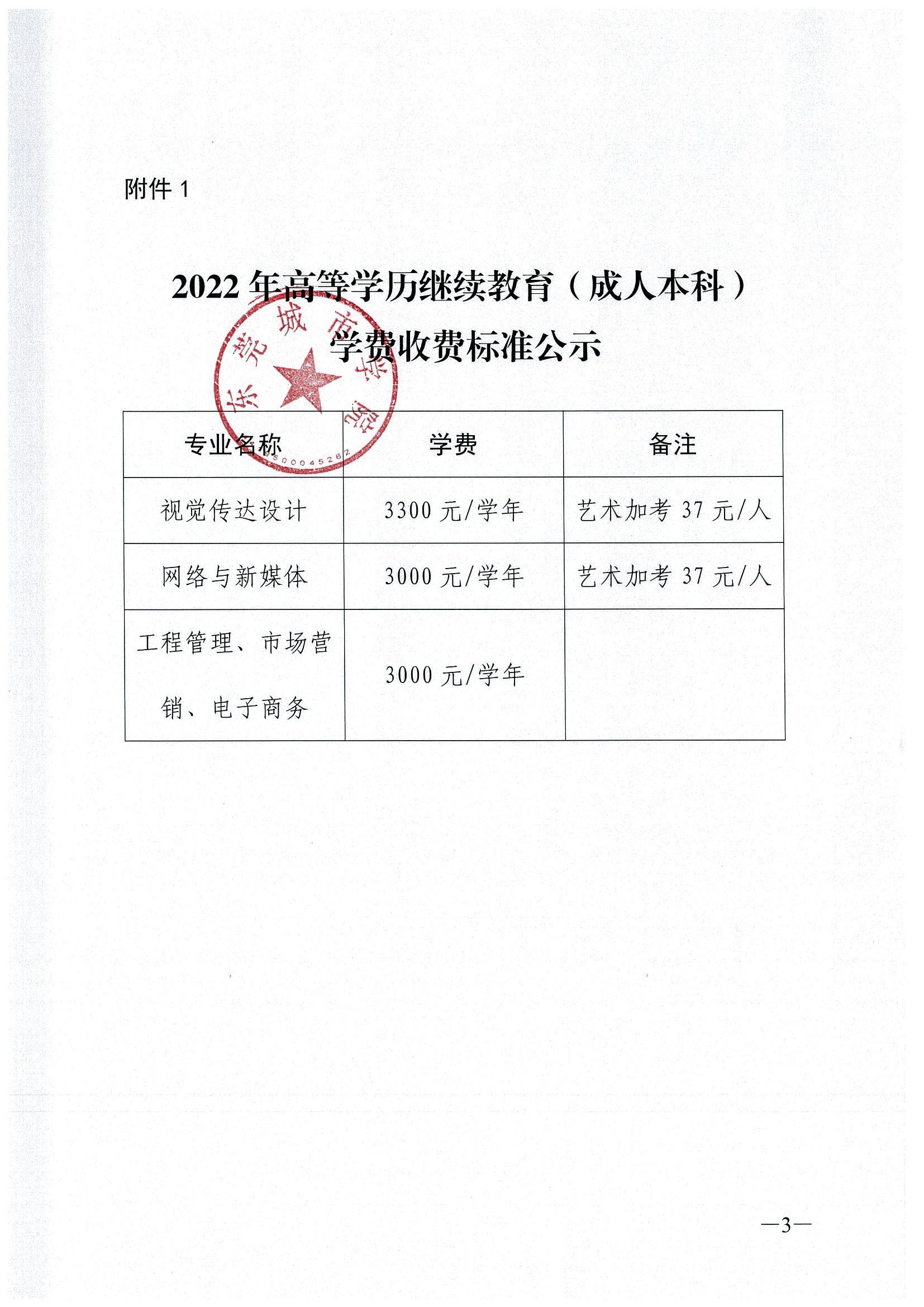 关于2022年高等学历继续教育(成人本科)和“圆梦计划”收费标准公示