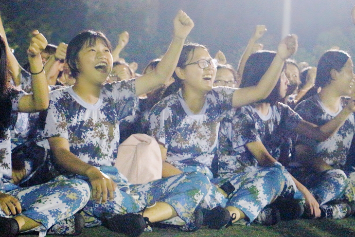 大赛当晚,军训团15个连队在运动场两侧席地而坐,拉歌声此起彼伏。在学校艺术团声乐队洪欣同学带来的《大鱼》的歌声中,红歌大赛拉开了序幕。