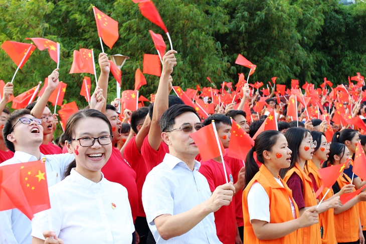 值此新中国成立七十周年之际,我们上万名师生手持红旗,身着红衣,齐声歌颂祖国。现场气氛热烈,欢欣鼓舞!校园里充满了浓浓的国庆氛围,校道旁绿色的紫荆花树边一抹抹红色的五星红旗、校门口红色的充气拱门和大红的灯笼、还有人人都去打卡的图书馆门楼上的巨幅五星红旗……学校用心营造出了一片红色的海洋,让我们广大师生深深为祖国自豪!为城院点赞!