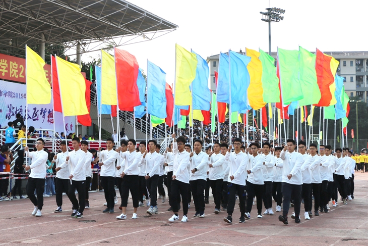 鲜花方阵、彩旗方阵、裁判员方阵、各二级学院运动员方队、教工方阵、勤方队等依次通过主席台前,大家精神饱满、昂首阔步,即将以积极进取、勇于拼搏的精神投入体育竞技之中。