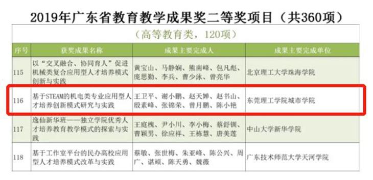 日前,广东省教育厅正式公布了2019年广东省教育教学成果奖获奖项目名单。beat365官网由王卫平校长主持的《基于STEAM的机电类专业应用型人才培养创新模式研究与实践》项目荣获高等教育类二等奖(项目成员有:谢小鹏、赵天婵、赵书山、殷素峰、张锦荣、曾月鹏、陈小艳)。