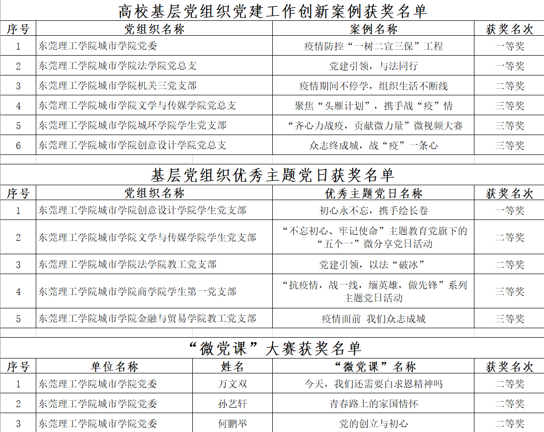 据东莞市委教育工委《关于公布优秀主题党日等评选活动结果的通知》,东莞理工学院城市学院党委在基层党组织优秀主题党日评选中荣获一等奖1项,二等奖2项,三等奖2项;在高校基层党组织党建工作创新案例评选中荣获一等奖2项,二等奖1项,三等奖3项;在 “微党课”大赛评选中荣获二等奖2项,三等奖1项。