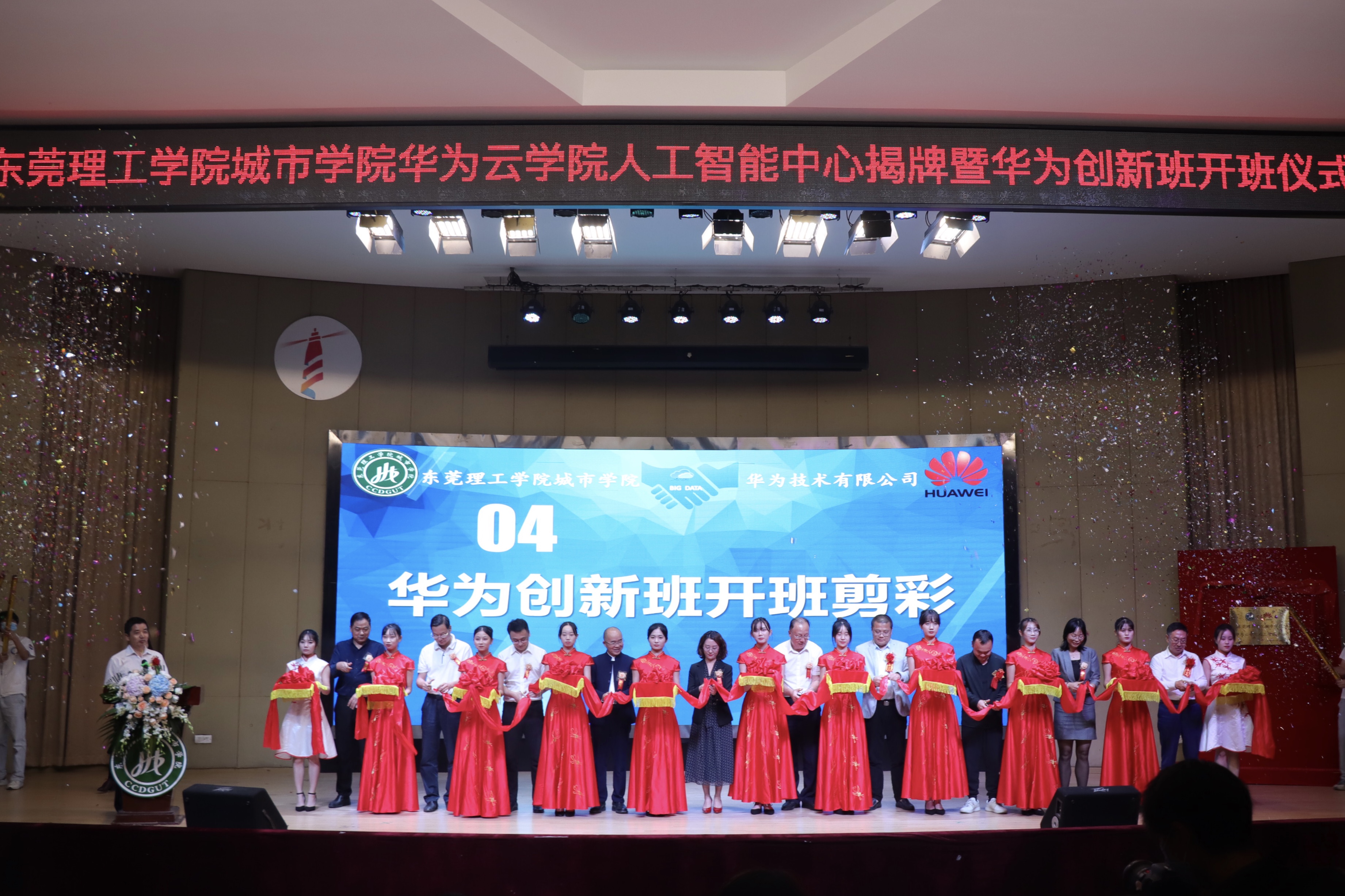 大会上,姜琳处长、孟令金总监、钟锦辉董事长、陈超群总经理、王卫平校长、牛熠院长等领导共同为“华为云学院人工智能中心”揭了牌,并为“华为创新班”开班剪了彩,共同预祝学校和华为合作取得佳绩。