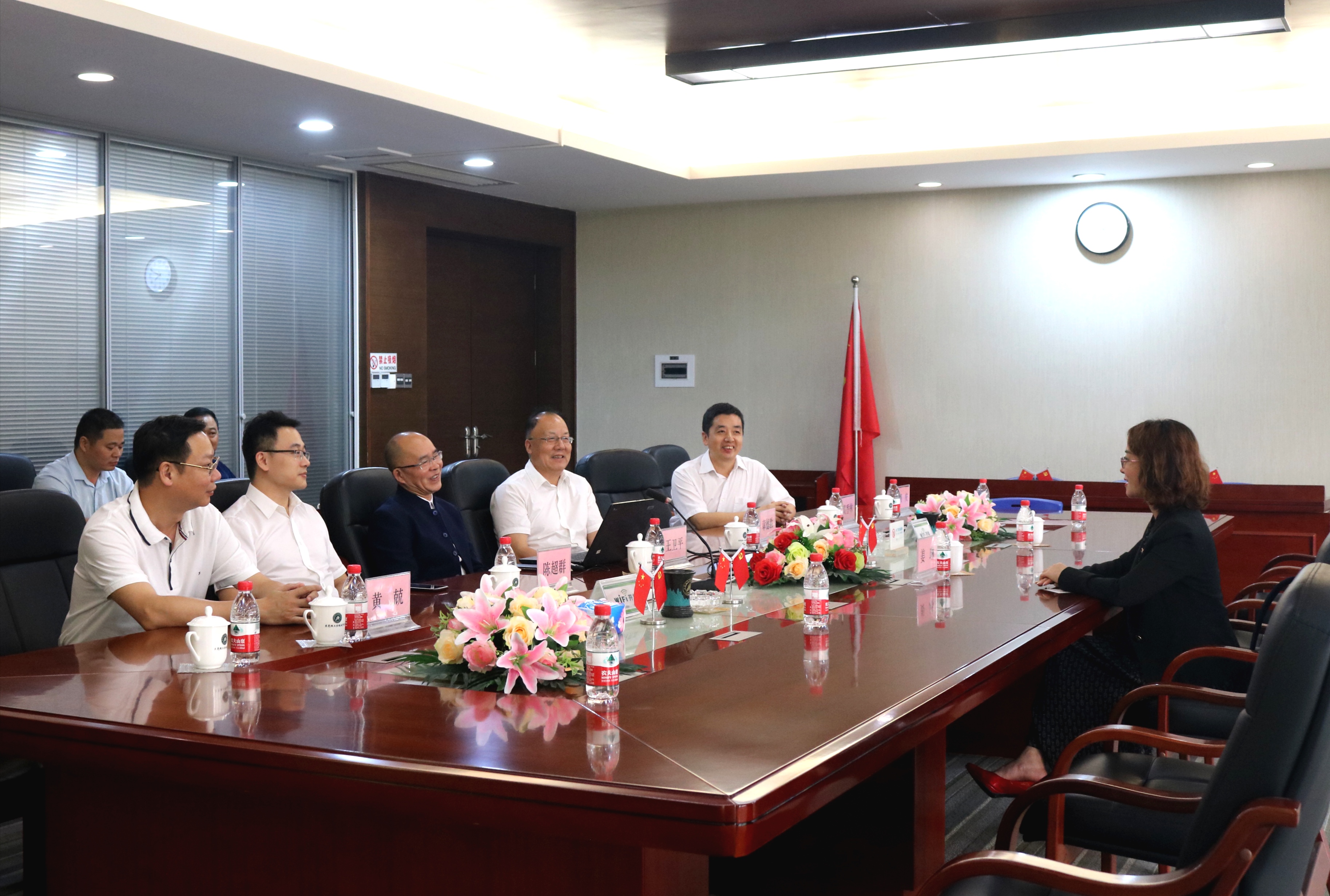 (姜琳处长、孟令金总监、钟锦辉董事长、陈超群总经理、王卫平校长、章德胜书记、黄兢副校长、周庆副校长、