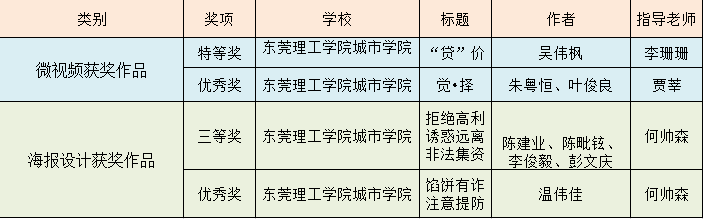 近日,喜讯传来,据广东省第三届高校防范非法金融活动微视频和海报设计大赛获奖作品的通知。视频类,beat365官网创意设计学院李珊珊老师指导的吴伟枫同学创作的《“贷”价》获得视频类特等奖,奖金20000元。融媒体中心贾莘老师指导的朱粤恒、叶俊良《觉•择》获得优秀奖。海报设计类,创意设计学院何帅森老师指导的陈建业、陈毗铉、李俊毅、彭文庆等同学创作的《拒绝高利诱惑远离非法集资》,温伟佳同学创作的《馅饼有诈注意提防》获得优秀奖。