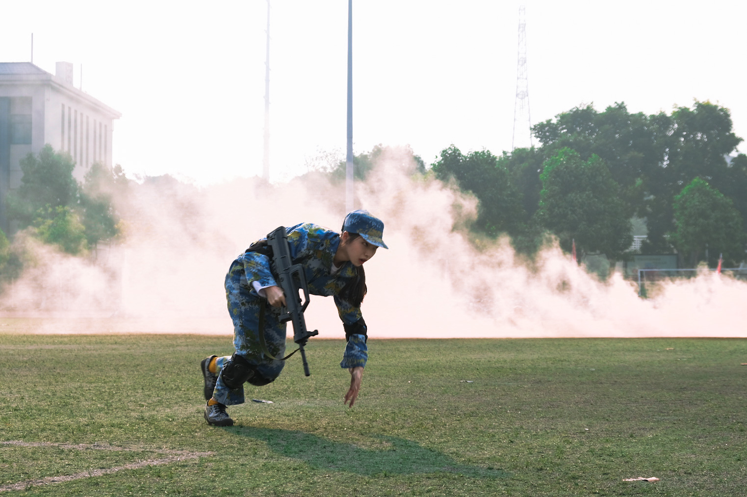 单兵战术基本操作环节,通过持枪、屈伸前进、匍匐前进、滚进,冲击敌兵成功炸毁敌碉堡,展现了2020年大一新生敢冲敢闯的气势。