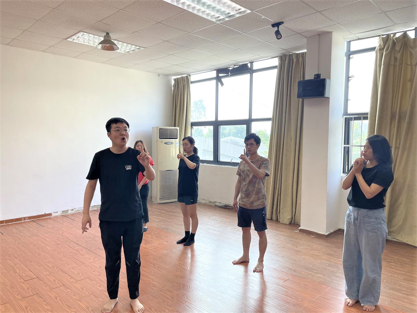 本次培训采取讲练方式,龙老师首先以小游戏的方式让参训教师感受声音的魅力,阐述了科学发声的概念,讲解了发声训练的方法与要求,通过科学的发声方法如何缓解器官的紧张和疲劳。随后,龙老师带领大家示范了一套嗓音保健操,对每一项发声要点进行详细说明,亲自示范“打牙关,凹舌头、气泡音、狗喘气、胸腹联合呼吸、呼吸控制”等呼吸训练方法,对在场教师的发音方法进行指导。同时,龙老师分析了课堂教学中教师如何提升声音的状态、清晰度和生动性,通过声音的轻重变化增强讲解语言的清晰性和逻辑性。最后,就参训教师提出的问题,龙老师提出以下建议:上课时语速应该适中,而不要过于急躁;学会运用合理的音量进行教学,并加以适当的肢体语言,让你的课堂教学更富感染力,而不是一味加大音量,把声音灌进学生的耳朵里。