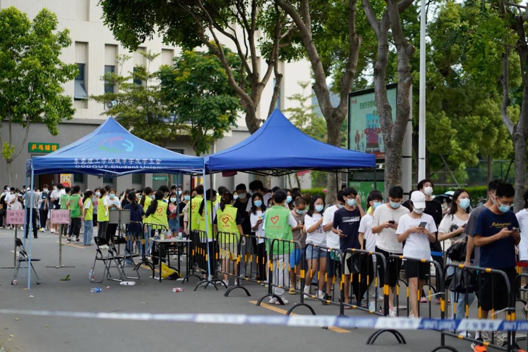 中午12点,综合馆前等待核酸检测的师生就排好了队,志愿者们到位集合。入党积极分子积极参与,奋战一线,成为团结和带动群众战胜疫情的中坚力量。他们对“粤康码”、“行程码”和“葵花码”仔细检查,对检测人员耐心指引,确保工作安全有序进行。