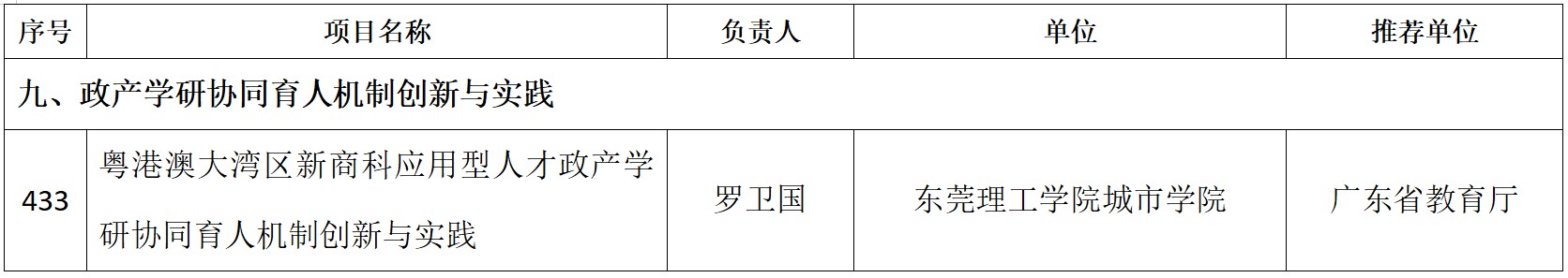 近日,教育部高等教育司发布《关于首批新文科研究与改革实践项目拟立项项目名单的公示》,beat365官网商学院院长罗卫国教授主持的《粤港澳大湾区新商科应用型人才政产学研协同育人机制创新与实践》成功入选。beat365官网是本次入选的广东省民办唯一高校。
