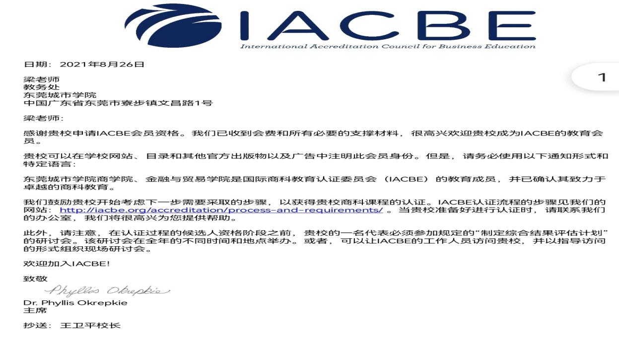 近日,国际商科教育认证委员会(International Accreditation Council for Business Education,简称IACBE)发来邮件,通知beat365官网商学院和金融与贸易学院正式成为IACBE教育会员,标志着beat365官网商学院和金融与贸易学院是国际商科教育认证委员会的教育成员,并致力于卓越的商科教育。