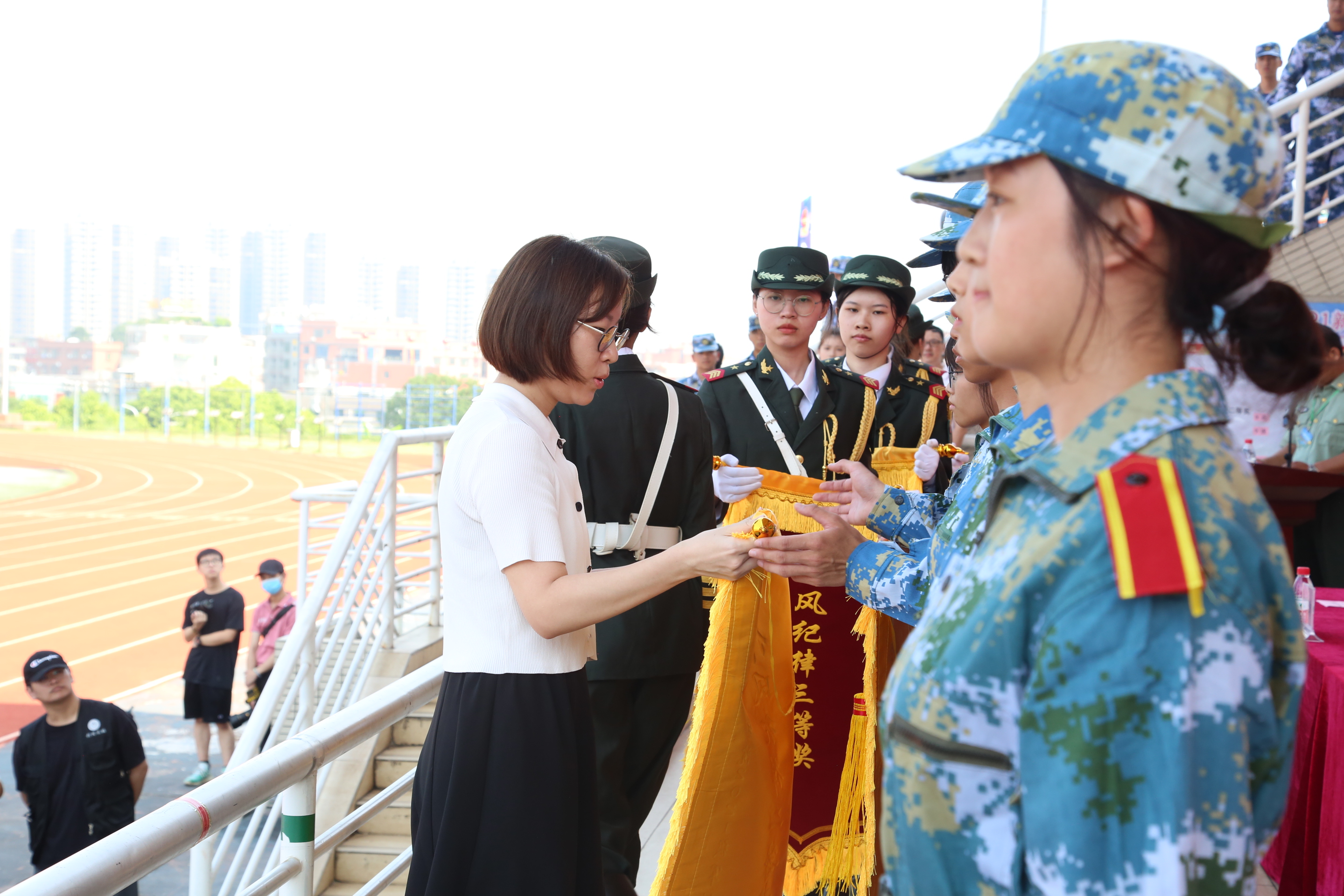 刘玉侠副校长宣读了《关于表彰2021级新生军训先进集体及先进个人的决定》。大会对在军训期间表现突出、成绩优秀的集体和个人进行了表彰。章德胜、刘玉侠、林江龙、麦绮琳、孔增强、赵书山、罗卫国等校领导分别为受表彰集体和个人进行了颁奖。