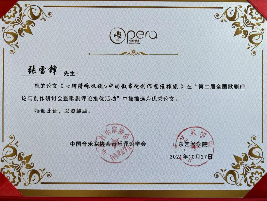 beat365平台官方网站艺术学院张雪锋老师受邀参加了此次全国性的学术研讨会,本次活动以“中国歌剧的民族化与国际化”为主题,面向全国广泛开展歌剧评论论文征集活动,组织专家设立审核小组进行集中遴选,从报送的80余篇论文中推选出优秀论文27篇,其中张雪锋老师论文《<阿绣咏叹调>中的叙事化创作思维探究》被评委专家推选为优秀论文,获选论文将汇编成文集由人民音乐出版社出版。