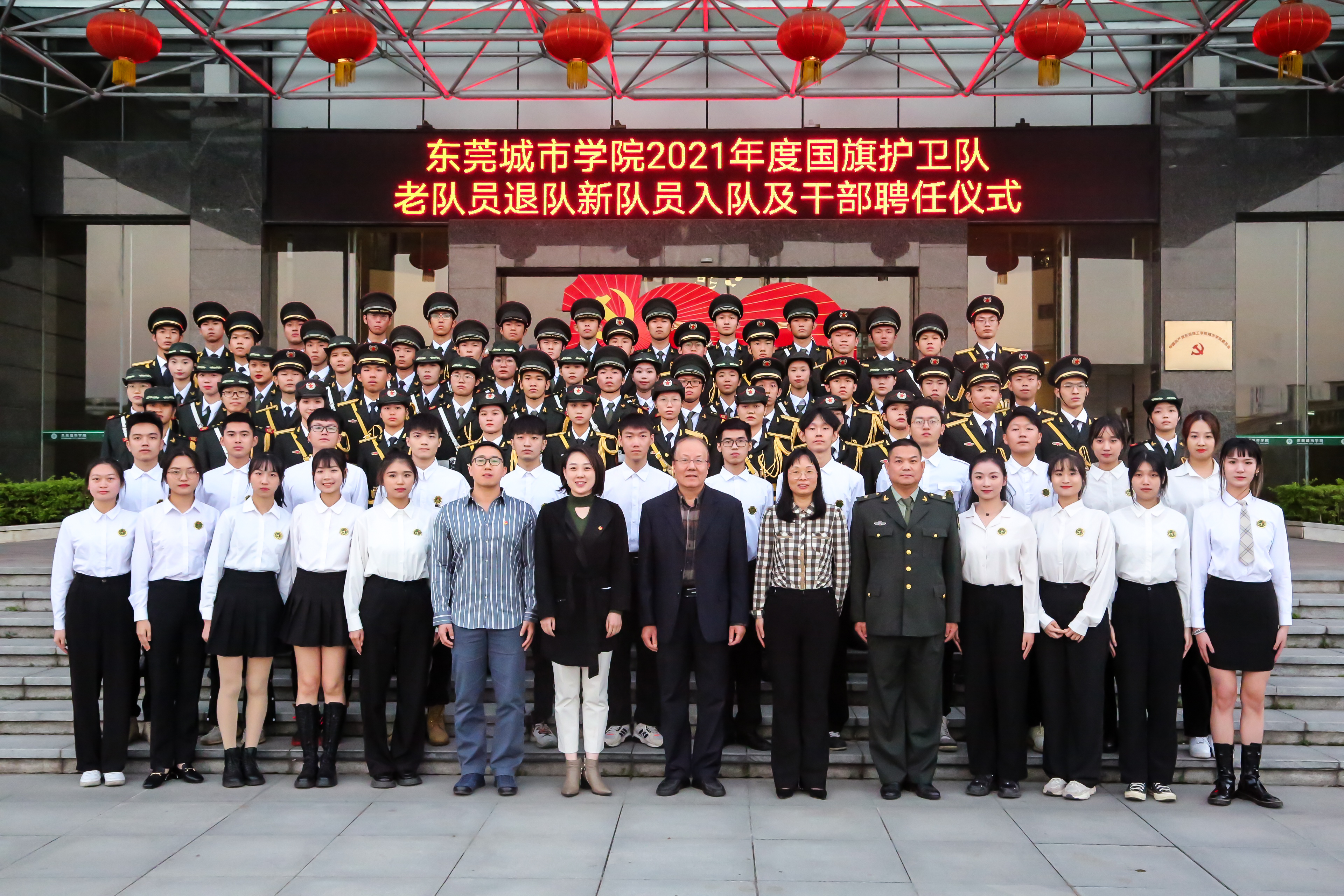 党委书记章德胜作了讲话。他指出国旗护卫队自成立以来,始终以护卫国旗为使命,以弘扬爱国主义精神为己任,以爱国、爱校、团结进取、积极向上的精神风貌为目标,展现当代大学生在校的一面校园文化旗帜。连续两年参加广东省学校国防教育成果交流展示及国旗护卫队比赛都获得“一等奖”好成绩。他对国旗护卫队提出三点希望:一是要“爱国旗,坚信念”。新一届的队员,应该珍惜每一次训练的机会,珍惜每一次升国旗的机会。永葆对国旗崇高的敬意;二是要“立大志,做大事”。作为中国新时代青年,除了完成护卫国旗的任务之外,更需立下远大志向,有抱负有担当;三是要“续传承,勇开拓”; 新队员不仅要传承国护精神,更要身体力行地弘扬红色文化。带动全体学生一起学,从学习中感悟共产党人的初心,从学习中汲取茁壮成长的精神力量。他希望各位队员能怀揣最初的热情,秉承国旗护卫队的队训“传承 责任 奉献 团结 ”,叫响国旗队的口号“一日护卫国旗,终身无上荣光”,在这大好青春中不断进取,绽放出自己最耀眼的青春光彩!