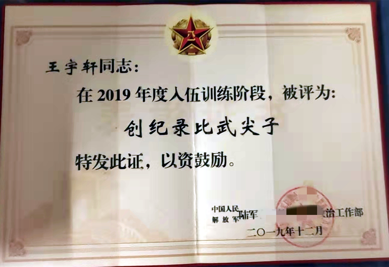经过数个月的磨练,王宇轩从一名社会青年、一名在校学生转变为一名“合格的战士”,还获得了“优秀新兵”的嘉奖,更是创下了军队比武记录的第一。