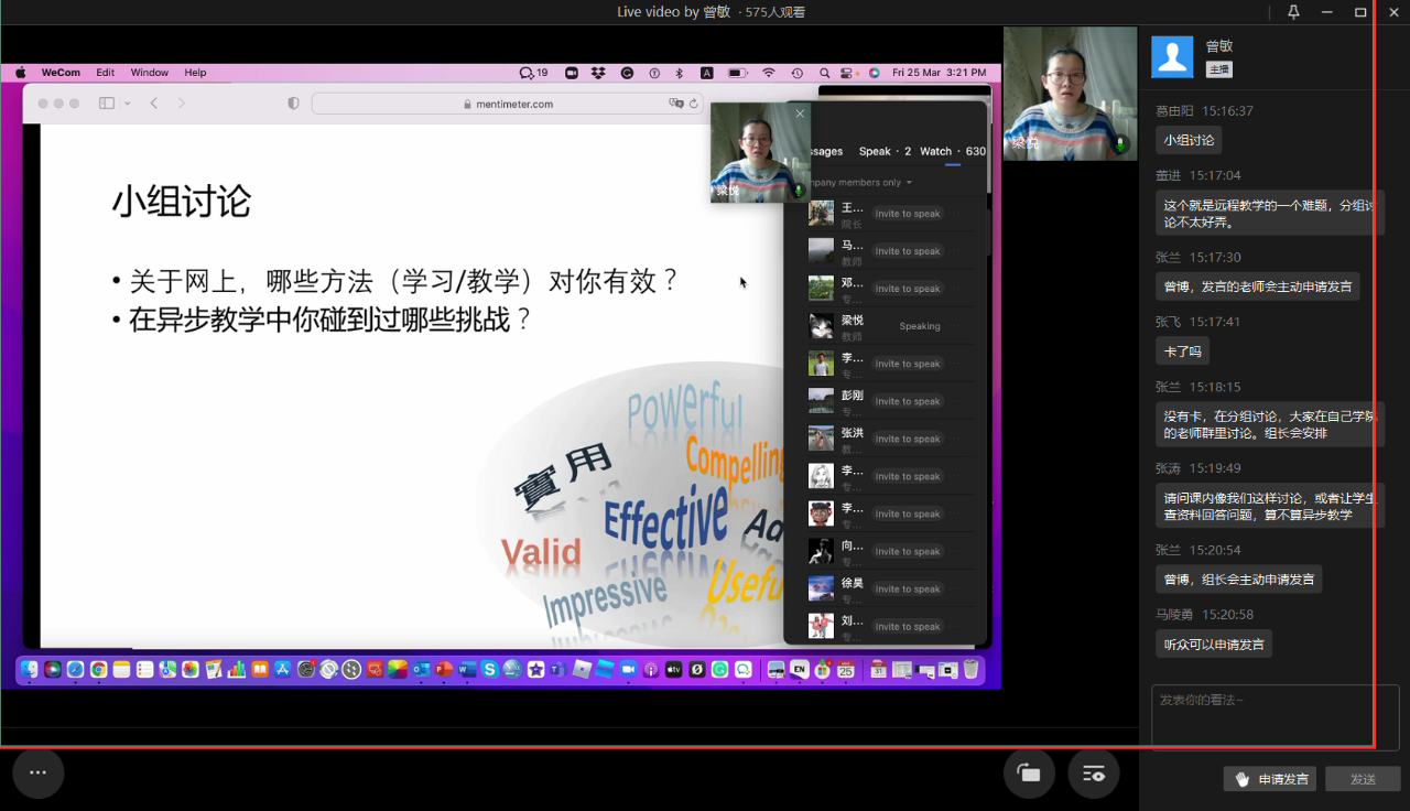 在线上培训课上,老师们积极响应,踊跃发言并讨论,认真学习线上教学的各项操作技巧,现场运用线上教学互动软件mentimeter与主讲专家进行互动。曾敏博士就参训教师在线上教学过程中遇到的难点、疑点给予了清晰而系统的答疑,针对具体问题提出了提升学生在线学习主动性的有效建议。
