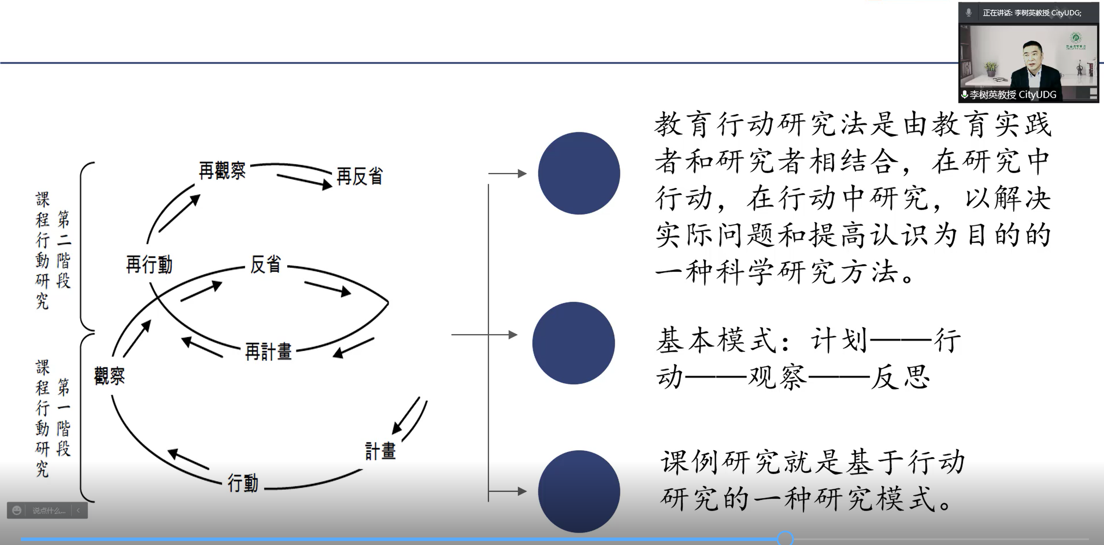 李树英教授运用语言学教学案例分享了一种教师教学研究中比较常用的研究方法:行动研究法。教师在行动中研究,在研究中行动,科学严谨地研究教与学的问题。螺旋式循环上升,从而不断提升教师的教学效能和专业水平,产出高质量的教学科研论文。最后,李教授还分享了他担任国际SSCI学术期刊的高级编辑的审稿和编审工作并鼓励教师从教学实践中寻找研究的热点问题,并循此科学严谨地研究学科的教学问题,定能产出高质量的学术论文。