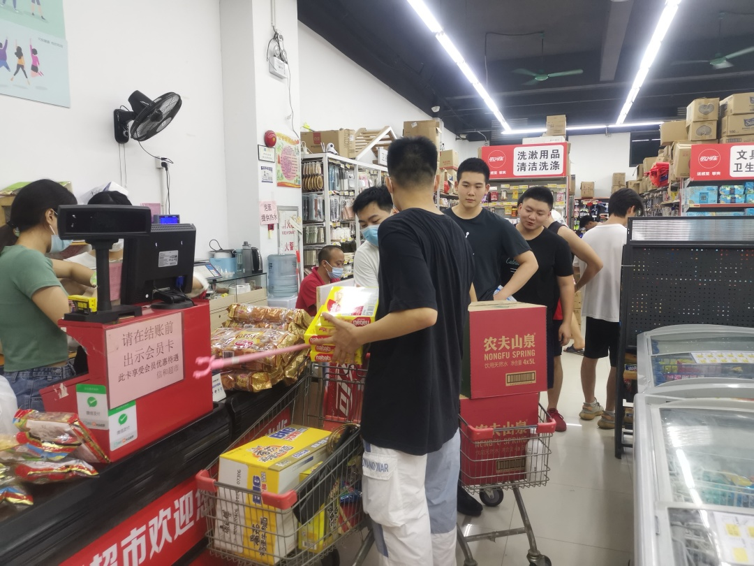 他们在超市里忙的热火朝天,汗水已不知不觉浸湿了衣背,一言一行中都透露着学院对隔离同学的关心和照顾。