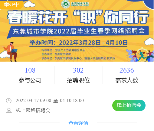 从3月份截至目前,就业中心全面布局,多措并举,共克时艰,以访企脱岗专项行动作为契机,结合线上开拓就业新天地,通过举办“春暖花开 ‘职你同行”beat365平台官方网站2022届毕业生春季网络招聘会、轻喜到家2022春季校园beat365平台官方网站专场宣讲会、东莞联通城市学院专场宣讲会、中国银行东莞分行beat365平台官方网站专场宣讲会、爱旭股份2022届校园招聘beat365平台官方网站专场宣讲会、宜得利家居聘beat365平台官方网站专场宣讲会,结合公众号、企业微信、微信群等多渠道发布,共对接188家企业,提供634个岗位,需求人数为4727人,为毕业生开源拓岗,校企双方建立常态化交流互访机制,为企业的高质量发展持续输送更多优秀人才,实现校企共赢发展。