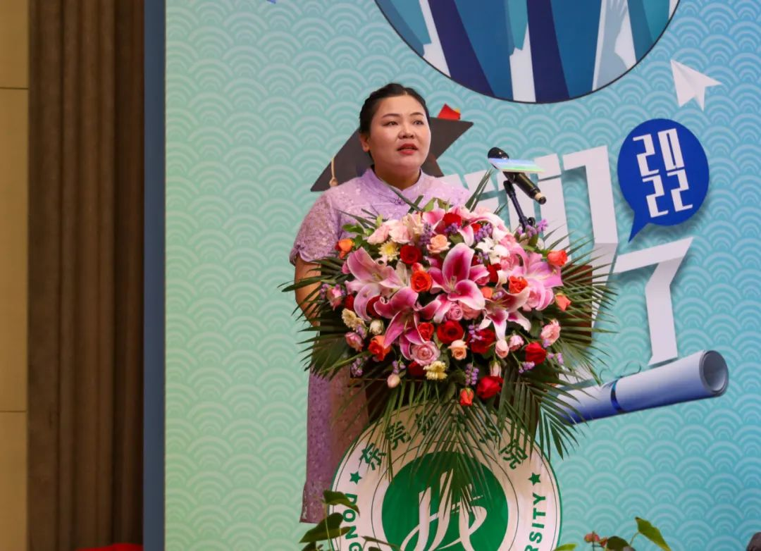 教师代表文学与传媒学院郭华副教授在发言中谈到希望毕业生们能向真而行,做志向远大、信念坚定的追梦者;向新而行,做逢山开路、遇河架桥的奋斗者,把好人生方向,跨千山暮雪、观万里层云,收获诗和远方。