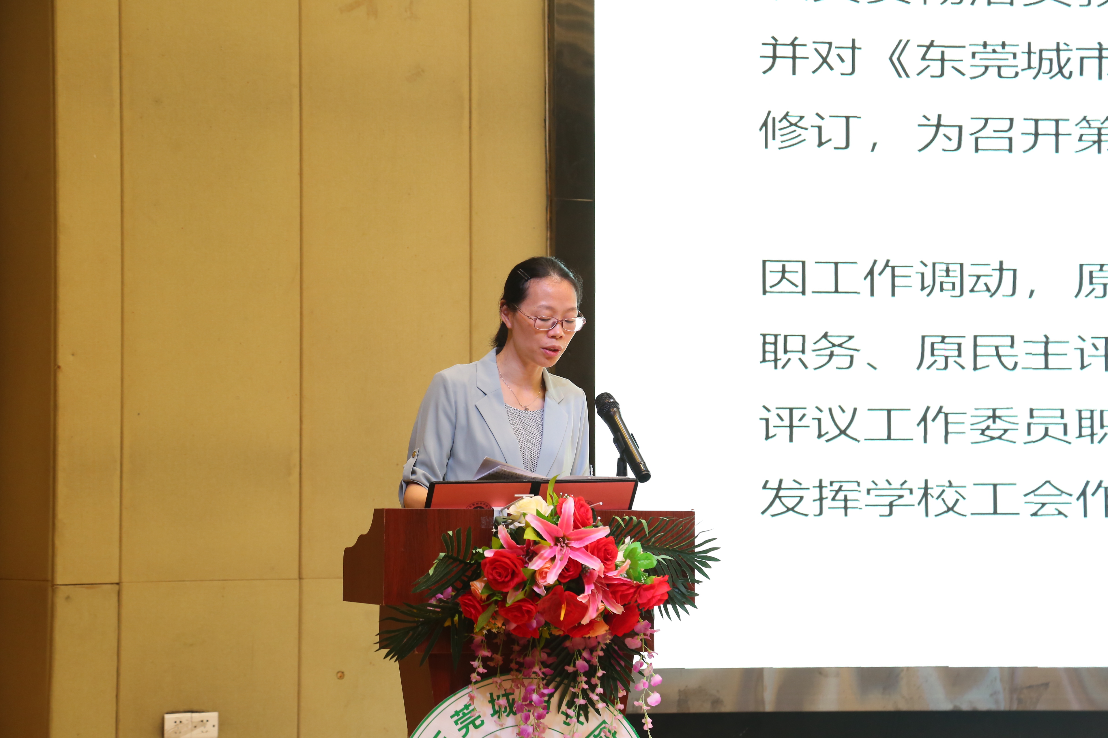 在雄壮激扬的国歌声中,大会拉开帷幕。执行校长李树英作《同心同德,干事创业,奋力推进学校高质量发展》的工作报告。报告全面回顾了学校2021-2022学年度工作情况。过去的一学年,学校完善发展顶层设计与管理领导体制设计,科学制定学校“十四五”发展规划,高标准高质量推动党史学习教育,进一步优化基层党组织设置,党建工作水平再获提升。学校坚持依法治校,全力做好新冠疫情防控工作,有效保障校园稳定。学校奋力推行人事制度改革,激发体制机制活力,不断优化师资队伍结构,提升人才队伍素质。学校招生规模创历史新高,构建了完备的三全育人体系,继续深入人才培养模式改革,进一步加强专业建设和课程建设。科研业绩大幅提升,学校启动硕士研究生联合培养,成功获批广东省博士工作站。学校不断加强国际交流与合作,构建全员参与、全领域覆盖的立体式新媒体平台,品牌建设水平不断提升。学校进一步完善校园硬件建设,新一代校园网建设完成更新,馆藏资源不断丰富,为师生提供更良好的学习生活环境。同时,李树英也指出了学校还存在一些不足之处。