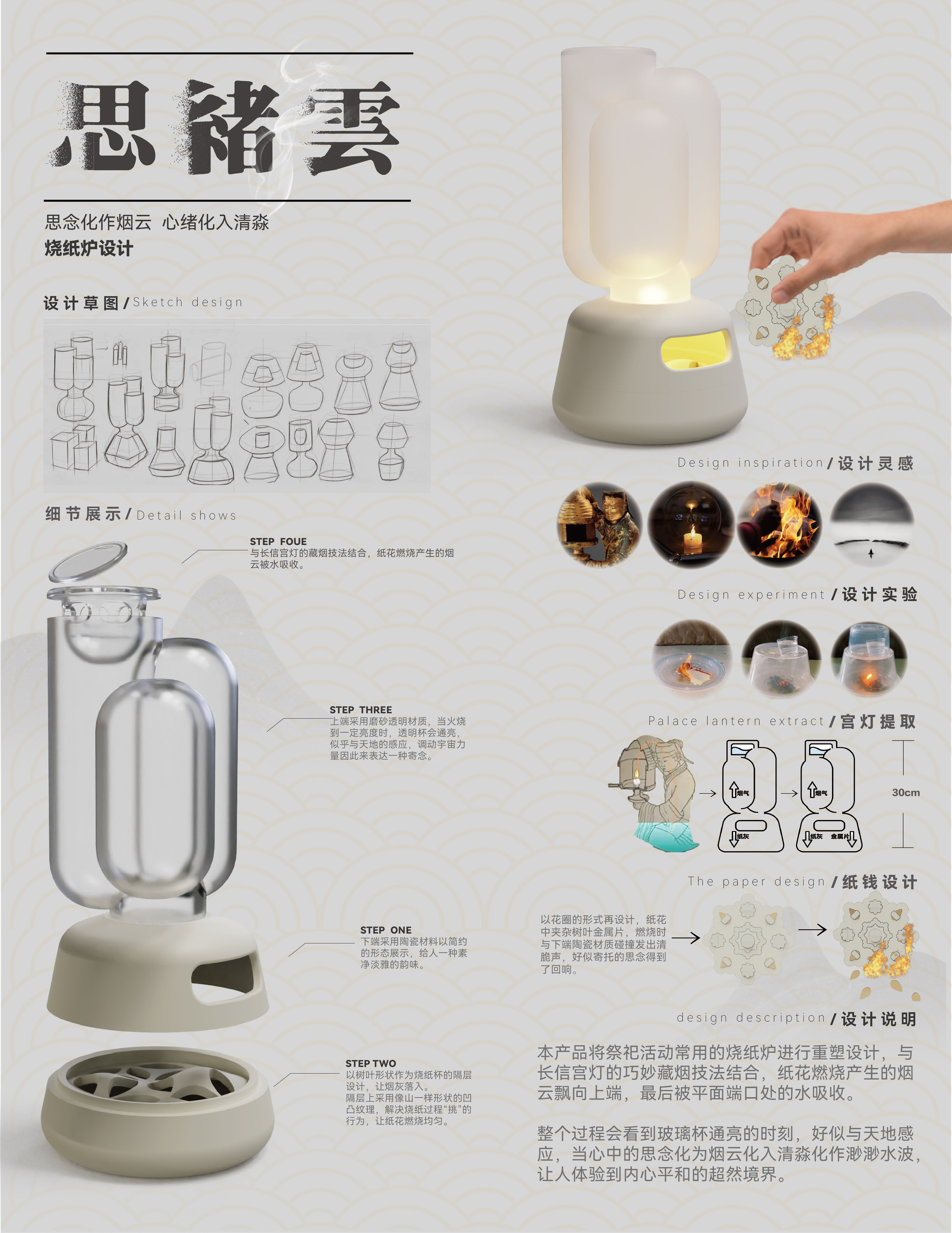 本产品将祭祀活动中常用的烧纸炉进行重塑设计,与长信宫灯的巧妙藏烟技法结合;纸花设计提取花圈形式再设计,纸花中夹杂树叶金属片,燃烧时与下端陶瓷材质碰撞发出清脆声,既有“落叶归根”的含义,又好似寄托的思念得到了回响,纸花燃烧产生的烟云飘向上端,最后被平面端口处的水吸收。