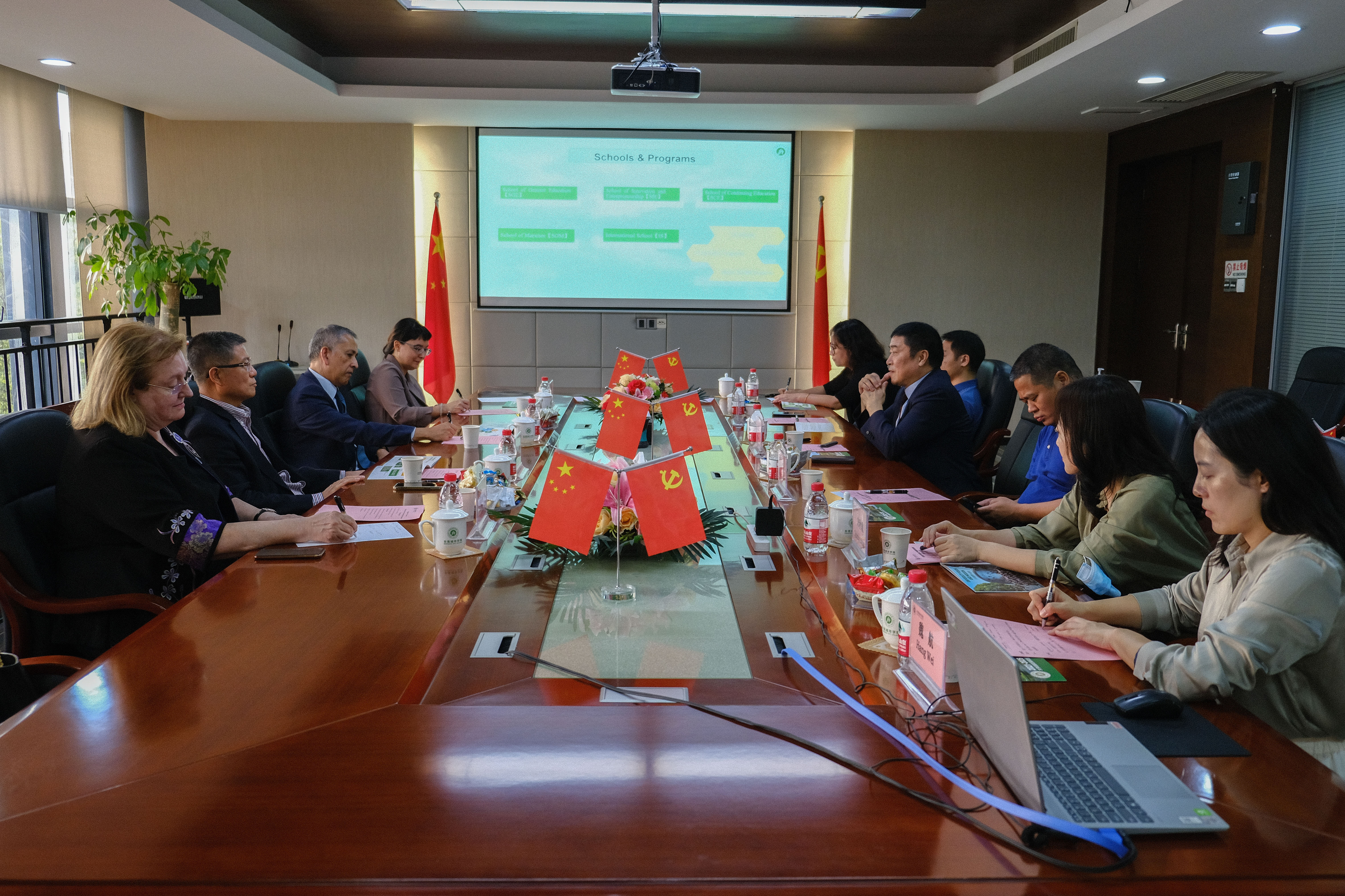 10月23日下午,澳门理工大学董事会主席李向玉,澳门中葡国际学校协会会长、国家政协委员Leonel Alves欧安利,学术总监、校长Doutora Rosa Bizarro以及行政负责人Edith Jorge一行到beat365官网交流访问,beat365官网执行校长李树英,校长助理、办公室主任孔增强,人力资源部部长李海冬,语言文化学院名誉院长宋秋敏、副院长丛蕊、全球交流合作处副处长魏航等参加会议。