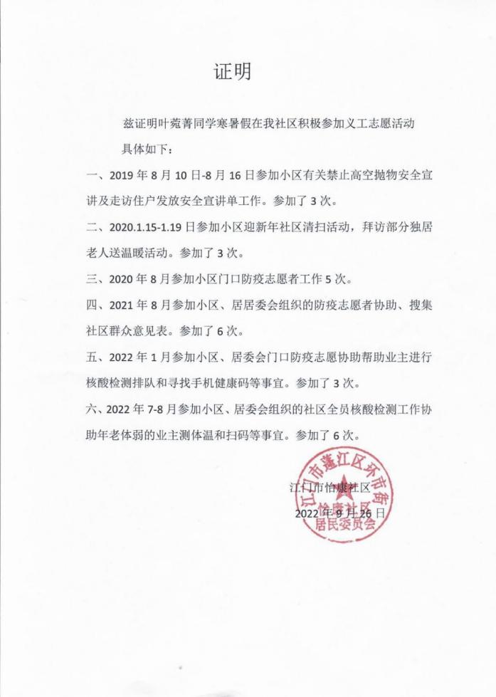 当谈到为何愿意参加助学活动时,叶菀菁说:“通过对困难学生家庭的走访,我看到了不一样的社情,也引发了我对社会、国家的关注与思考。我看到一些困难孩子,觉得帮助他们读书才能改变他们自己和家庭的命运。在这些活动中,我既锻炼了自己,又帮助了他人、服务了社会。”当问及为何会坚持捐助时,叶菀菁回答说:“以前我也很喜欢购物,但到那些地方的时候我深深地感受到,或许我并不是真的需要这些消费,但他们是真的很需要那一笔钱。今年我也捐赠了在江门幼儿园打暑假工获得的3500元工资。”