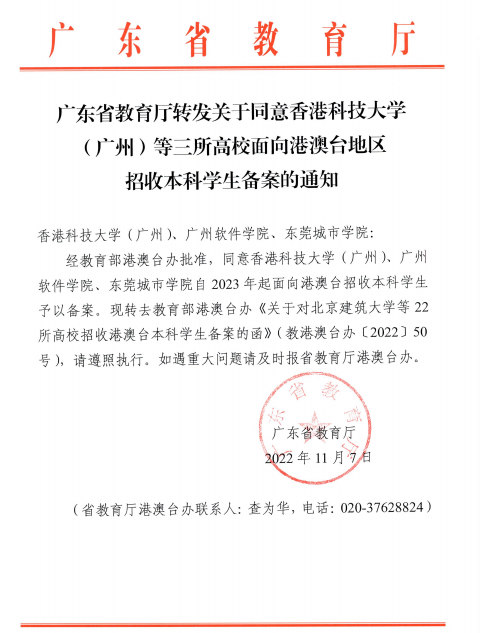 据悉,广东省新增获批2023年起面向港澳台招收本科学生资格的学校包括:香港科技大学(广州)、广州软件学院、beat365平台官方网站,共3所。