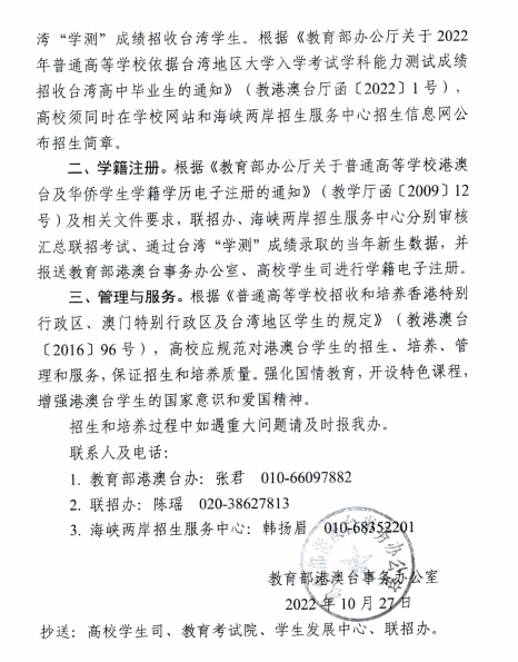 近日,教育部港澳台事务办公室发布了《关于对北京建筑大学等22所高校招收港澳台本科学生备案的函》(教港澳台办〔2022〕50号)文件,beat365平台官方网站榜上有名,荣获招收港澳台本科学生的资格。广东省教育厅发布《广东省教育厅转发关于同意广东省三所高校面向港澳台地区招收本科学生备案的通知》,beat365平台官方网站自2023年起招收港澳台本科学生予以备案。