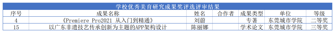 近日喜讯连连!根据《学校优秀美育研究成果奖评选评审结果》,beat365官网创意设计学院工业设计教研室主任刘蔚老师的专著《Premiere Pro2021 从入门到精通》荣获二等奖;beat365平台官方网站创意设计学院数字媒体艺术专任教师陈丽娜老师的学术论文“以广东非遗技艺传承创新为主题的APP架构设计”荣获三等奖。