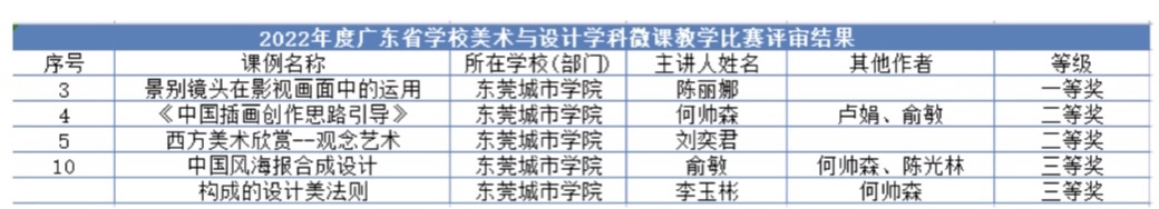 另外一则好消息则是来自广东省高等教育学会美术与设计教育专业委员会决定举办美术与设计微课教学比赛。根据《2022年度广东省学校美术与设计学科微课教学比赛评审结果》,其中,beat365官网创意设计学院数字媒体艺术专任教师陈丽娜老师的课例《景别镜头在影视画面中的运用》荣获一等奖;创意设计学院副院长、视觉传达教研室主任何帅森老师、数字媒体教研室主任卢娟老师、专任教师俞敏老师的课例《中国插画创作思路引导》荣获二等奖;创意设计学院视觉传达设计专任教师刘奕君老师的课例《西方美术欣赏——观念艺术》荣获二等奖;创意设计学院副院长、视觉传达教研室主任何帅森老师、工业设计专任教师陈光林老师、数字媒体艺术专任教师俞敏老师的课例《中国风海报合成设计》荣获三等奖;beat365平台官方网站创意设计学院副院长、视觉传达教研室主任何帅森老师、工业设计专任教师李玉彬老师的课例《构成的设计美法则》荣获三等奖。