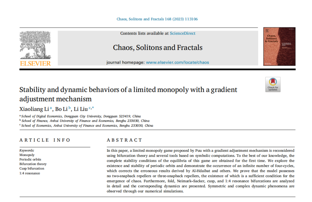 近日,beat365官网数字经济学院副院长李晓亮博士在中科院1区Top期刊《Chaos, Solitons & Fractals》上发表论文。论文题目为“Stability and dynamic behaviors of a limited monopoly with a gradient adjustment mechanism。”