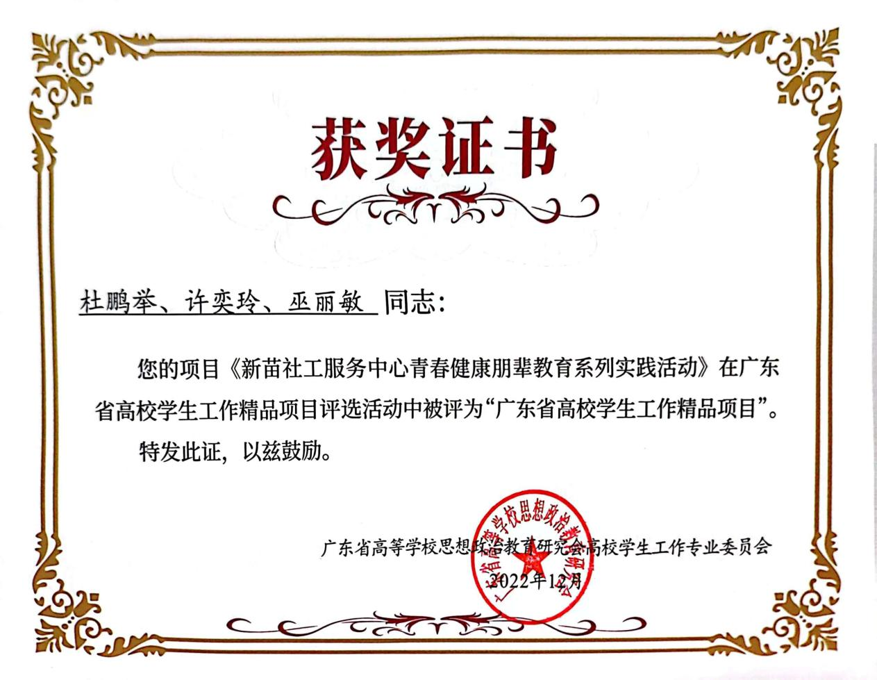 beat365官网《新苗社工服务中心青春健康朋辈教育系列实践活动》项目,成功获评2022年“广东省高校学生工作精品项目”。
