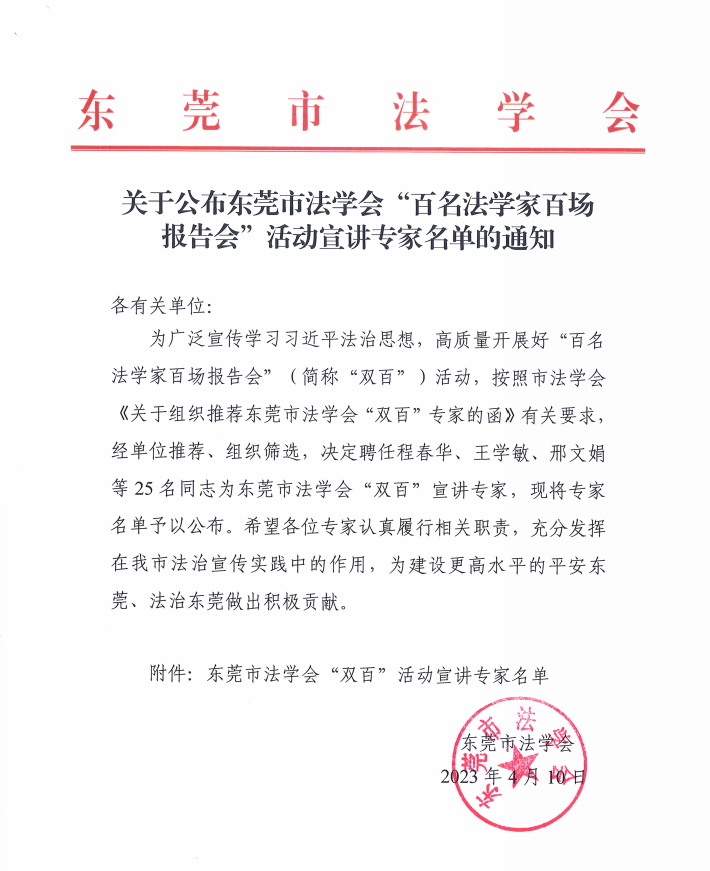 近日,东莞市法学会发文公布“百名法学家百场报告会”(简称“双百”)宣讲专家,beat365官网刘杰教授和李阳桂博士与来自市委党校、法院、东莞理工学院等单位的25人获聘为“双百”宣讲专家。
