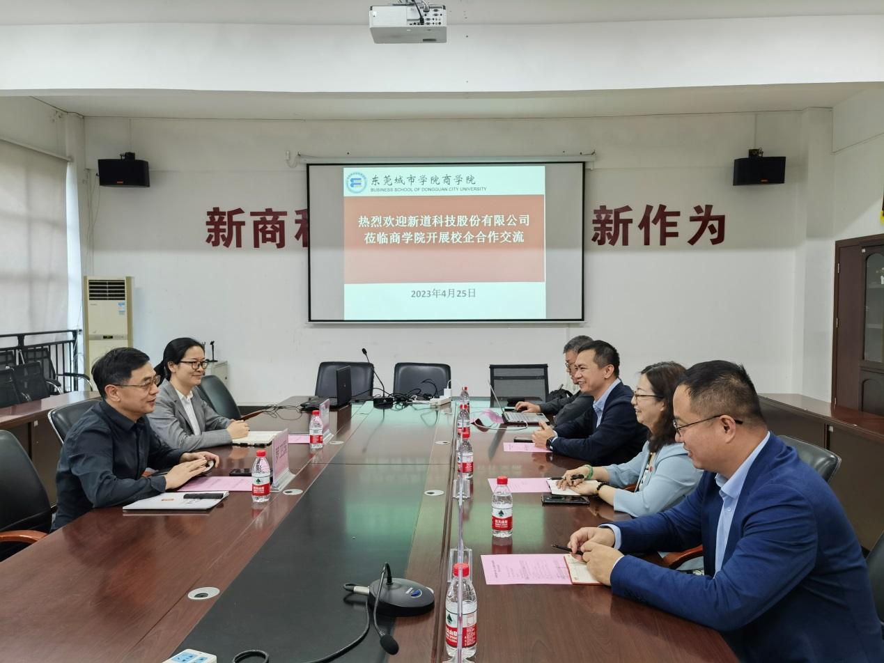 为促进产教结合,创新人才培养模式,4月25日下午,新道科技股份有限公司助理总裁刘莉一行莅临商学院开展合作交流会。商学院院长罗卫国、副院长张洪参加会议。