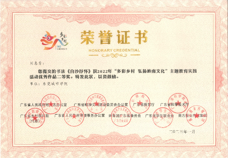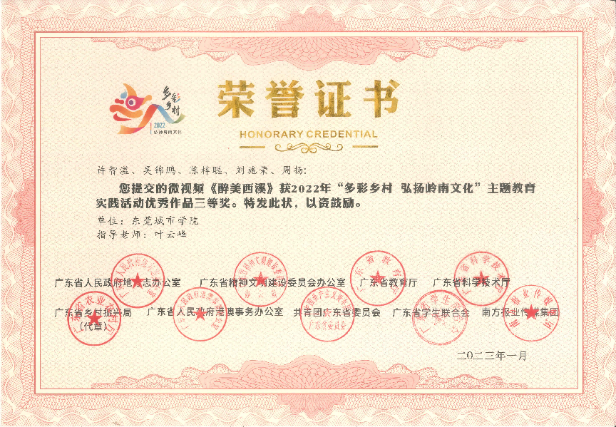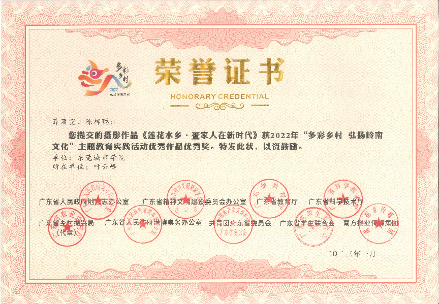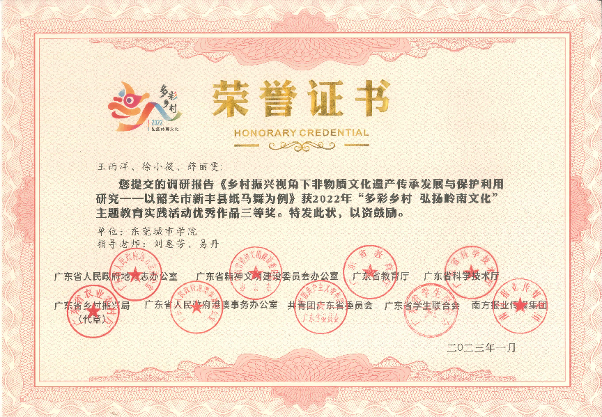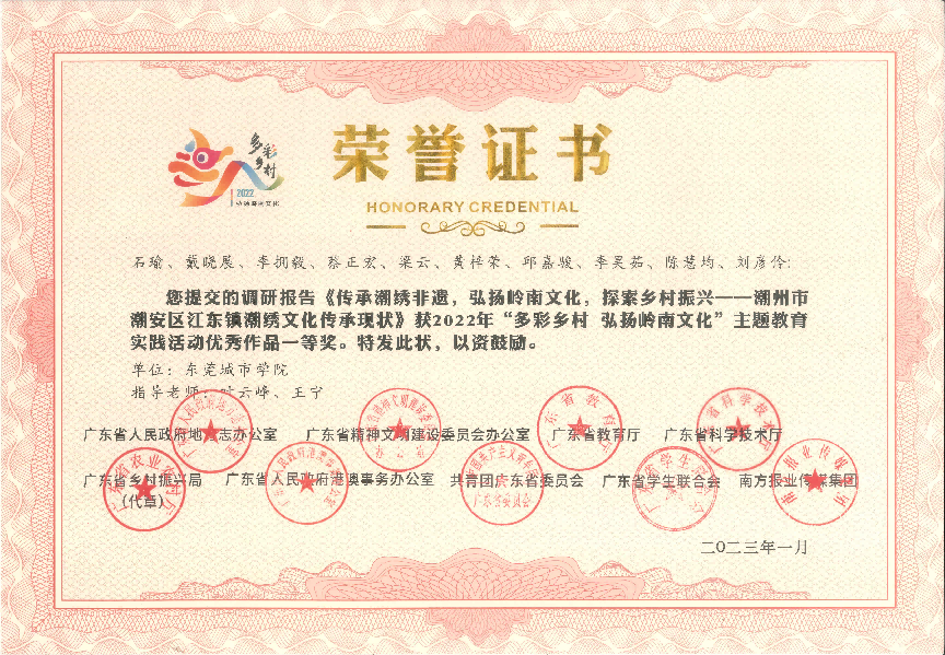 近日传来喜讯!在2022年,由广东省人民政府地方志办公室、广东省精神文明建设委员会办公室、广东省教育厅、广东省科学技术厅、广东省乡村振兴局、广东省人民政府港澳事务办公室、共青团广东省委员会广东省学生联合会、南方报业传媒集团联合组织开展的 2022年“多彩乡村 弘扬岭南文化”主题教育实践活动中,beat365官网获得一等奖1项,二等奖1项,三等奖2项,优秀奖1项,并获优秀组织单位。