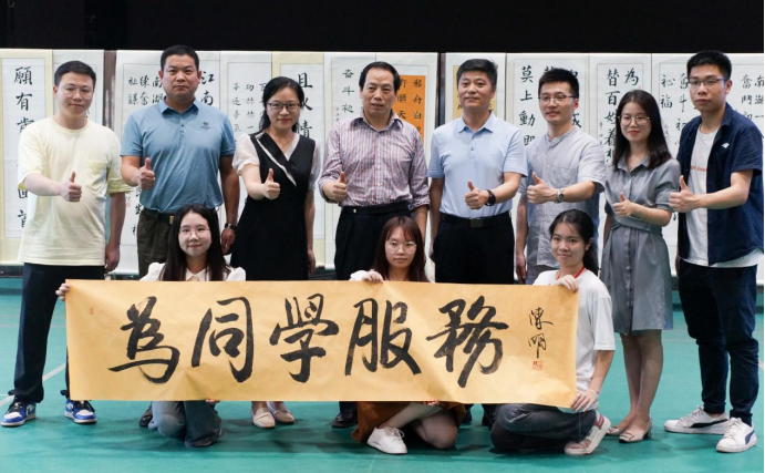 现场陈明校长为校学生会赠字“为同学服务”,由校学生会主席团成员作为代表接受赠字。陈明校长希望校学生会全体人员保持从同学中来,到同学中去,全心全意为同学服务的初心。