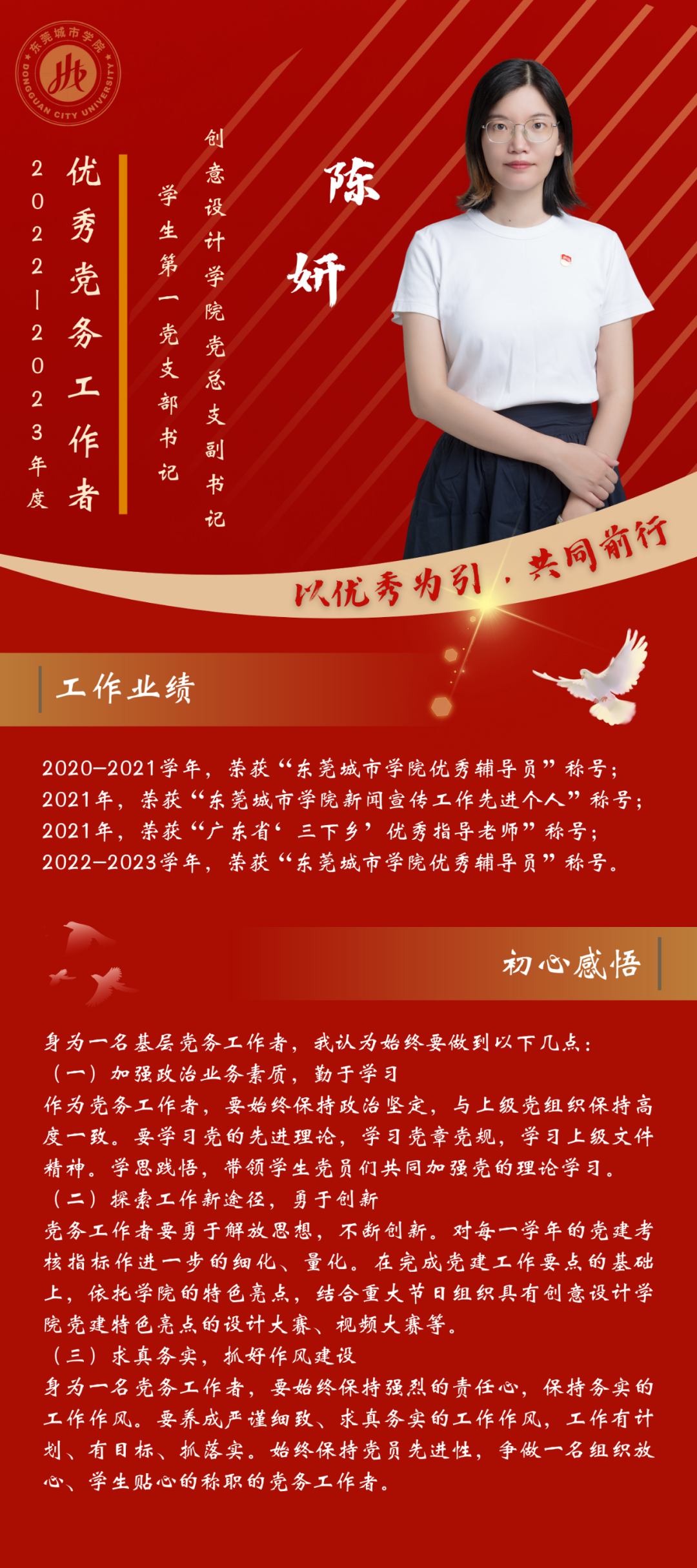 一名党员,就是一面旗帜。为发挥先进典型的示范作用,弘扬党的光荣传统和优良作风,我们推出“优秀党务工作者”风采展,充分展示beat365官网广大党员干部坚守初心使命、勇于担当作为的政治本色。让我们向优秀学习、向先进看齐,在新时代新征程中展现新作为新担当,不断开创学校教育事业发展新局面。
