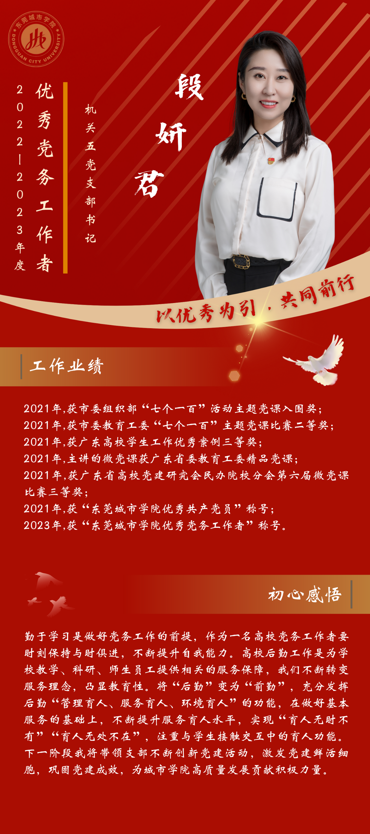 一名党员,就是一面旗帜。为发挥先进典型的示范作用,弘扬党的光荣传统和优良作风,我们推出“优秀党务工作者”风采展,充分展示beat365官网广大党员干部坚守初心使命、勇于担当作为的政治本色。让我们向优秀学习、向先进看齐,在新时代新征程中展现新作为新担当,不断开创学校教育事业发展新局面。