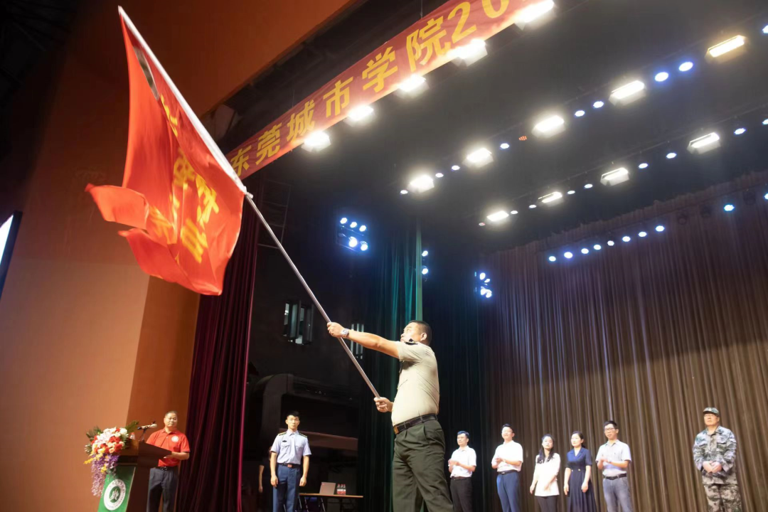 仪式上,beat365官网校长陈明向刘维仝团长授“beat365平台官方网站军训团团旗”
