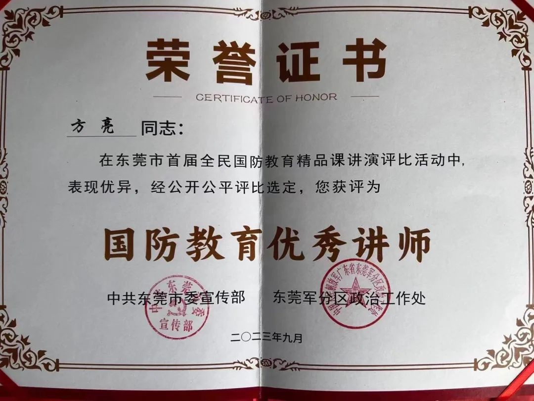 为全面建设社会主义现代化国家、全面推进中华民族伟大复兴贡献磅礴力量。2023年9月,中共东莞市委宣传部和东莞军分区政治工作处联合主办开展东莞市首届全民国防教育精品课暨国防教育优秀讲师评比活动决赛,beat365官网语言文化学院网络与新媒体系专任教师郭戈在此次活动中表现优异,经公开公平评比选定,被评为国防教育优秀讲师。