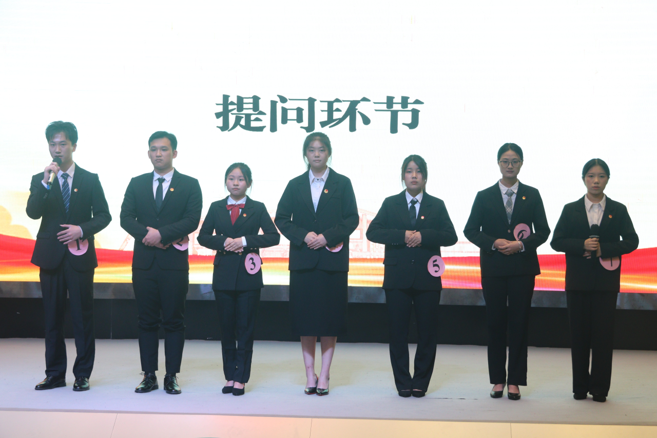 七位校学生会主席团候选人依次上台进行竞选演讲。随后,现场的各位老师和学生代表向七名候选人发起提问。