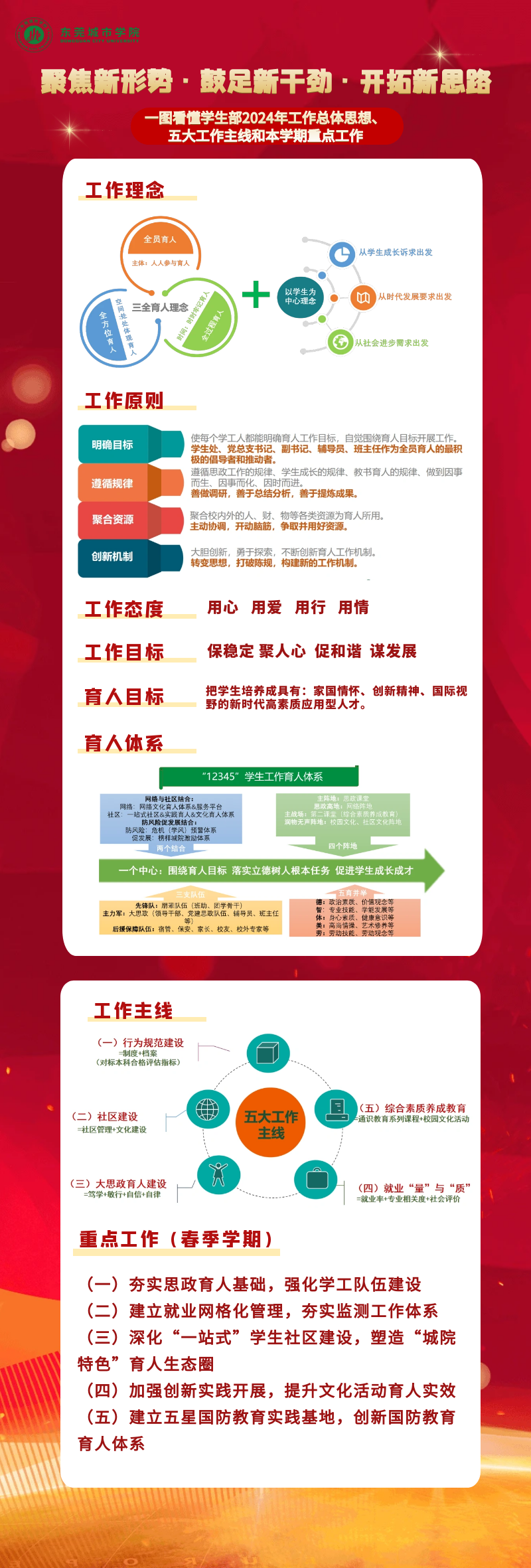 会议首先由学生部副部长(主持工作)林蓉作2024年学生管理就业工作报告。报告结合推进学校学生工作的高质量发展目标,围绕学工队伍建设、就业网格化管理、一站式学生社区建设、共青团品牌建设、国防教育与大学生征兵等做出新学期工作部署。报告指出,2024年学生工作要把握新形势、新任务和新要求,回顾总结成功经验,大胆突破创新,笃定实干,砥砺前行,为学校高质量发展做出新的贡献。