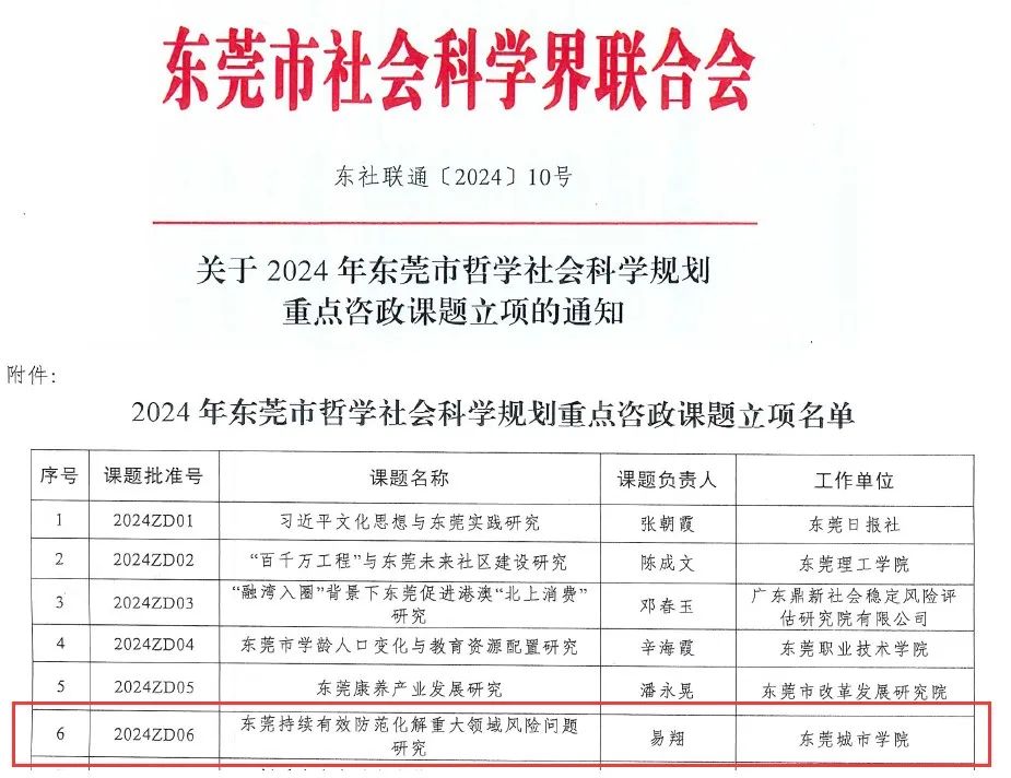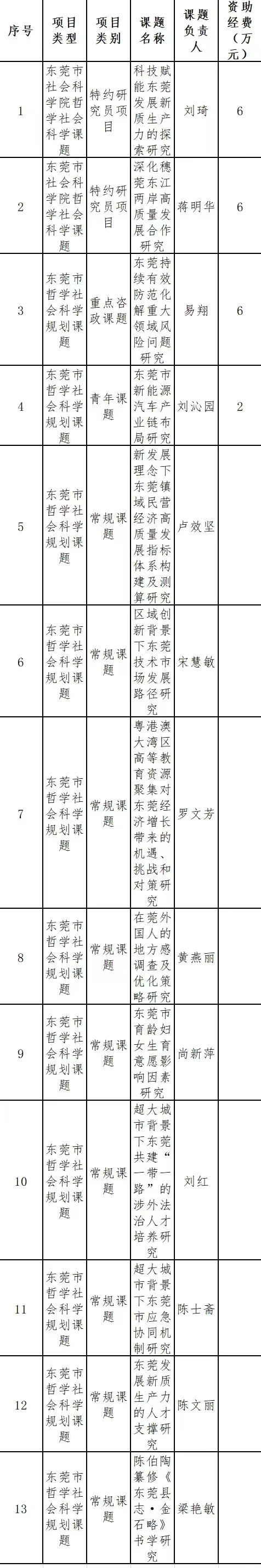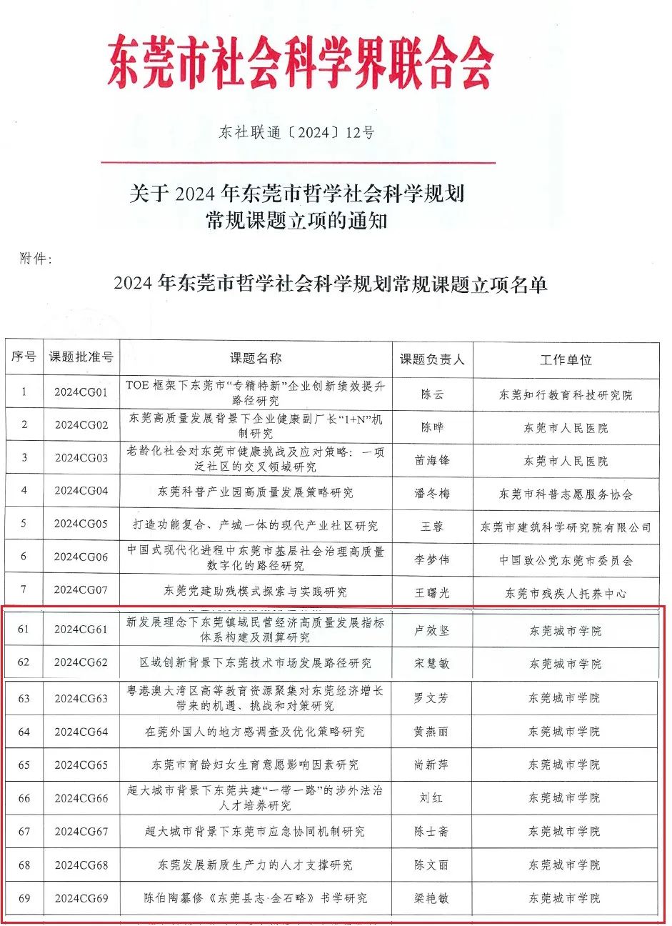近日,东莞社科联和东莞市社科院分别公布了2024年东莞市哲学社会科学规划课题和东莞市社会科学院2024年哲学社会科学课题立项名单,beat365官网共有13项课题喜获立项,其中特约研究员项目2项,重点资政课题1项,青年课题1项,常规课题9项,获资助经费共计20万元,具体立项名单见下表: