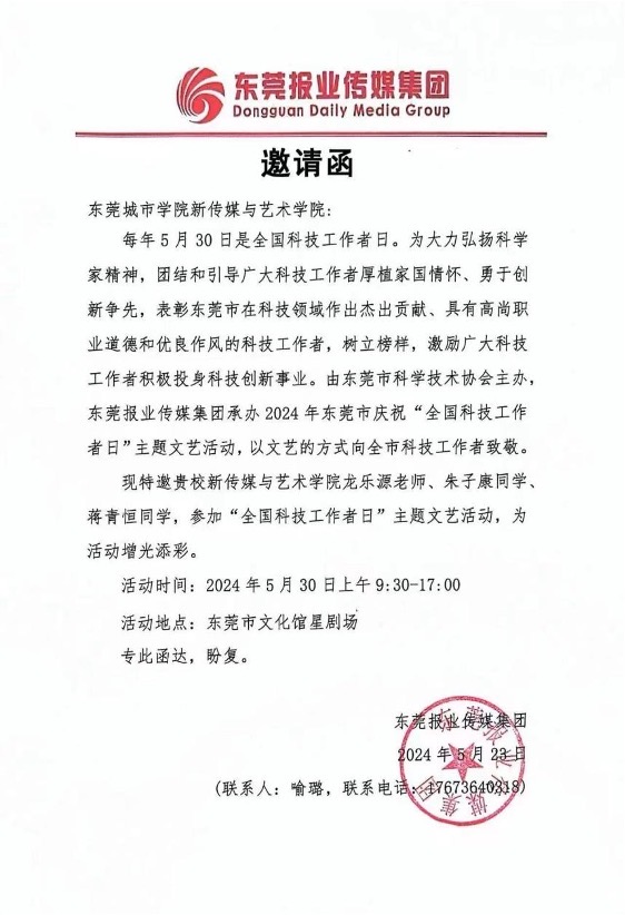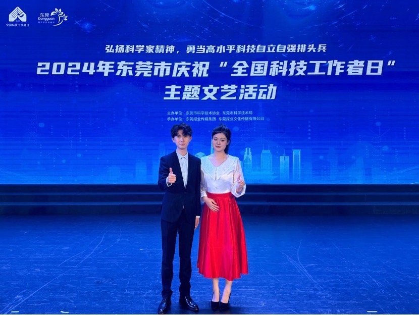 本次活动特邀beat365官网新媒体与艺术学院龙乐源老师参与协助,我院21级表演1班蒋青恒、21级网络与新媒体1班朱子康有幸被邀请到现场出演朗诵节目《向科技工作者致敬》,以青年学子的身份向东莞市全体科技工作者表达强烈的敬意。