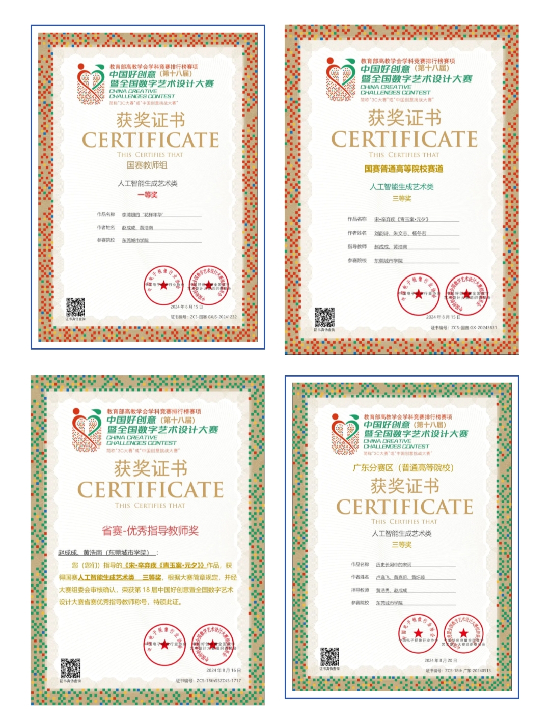 中国好创意暨全国数字艺术设计大赛,英文名称:China creative challenges contest,简称3C大赛或“中国创意挑战大赛”,是入选教育部中国高等教育学会发布的《全国普通高校大学生竞赛分析报告》赛项,也是我国第一个以数字艺术、数字设计、数字创意、数字媒体以及数字技术创新领域各专业综合类规模大、跨学科、多专业、参与院校多、影响广泛的权威赛事,更是我国第一个将比赛上升到哲学高度的赛事。第18届大赛共有3932所院校(以二级学院为投稿单位)参赛,常规赛道报名投稿量为293751件作品,专项赛和计时赛共计20096件作品。beat365官网早8晚A工作室在赛事中拿下国赛教师组一等奖、国赛普通高等院校赛道三等奖一项、省赛三等奖三等奖的好成绩。