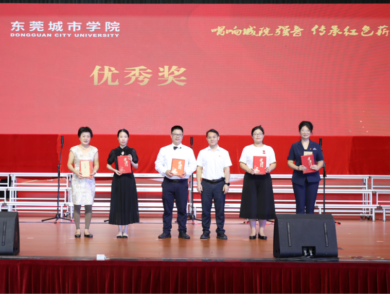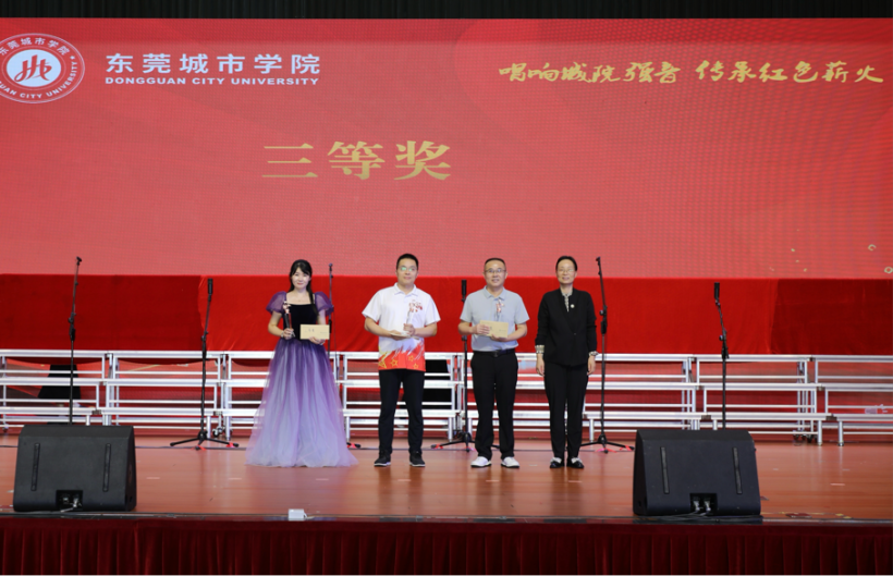 比赛中,各参赛队伍激情澎湃,用歌声诠释了对党和祖国的热爱,充分展现了城院人的精神风貌和爱国情怀。经过激烈角逐,比赛最终评选出一、二、三等奖及优秀奖。学校领导分别为获奖队伍颁奖并合影留念。