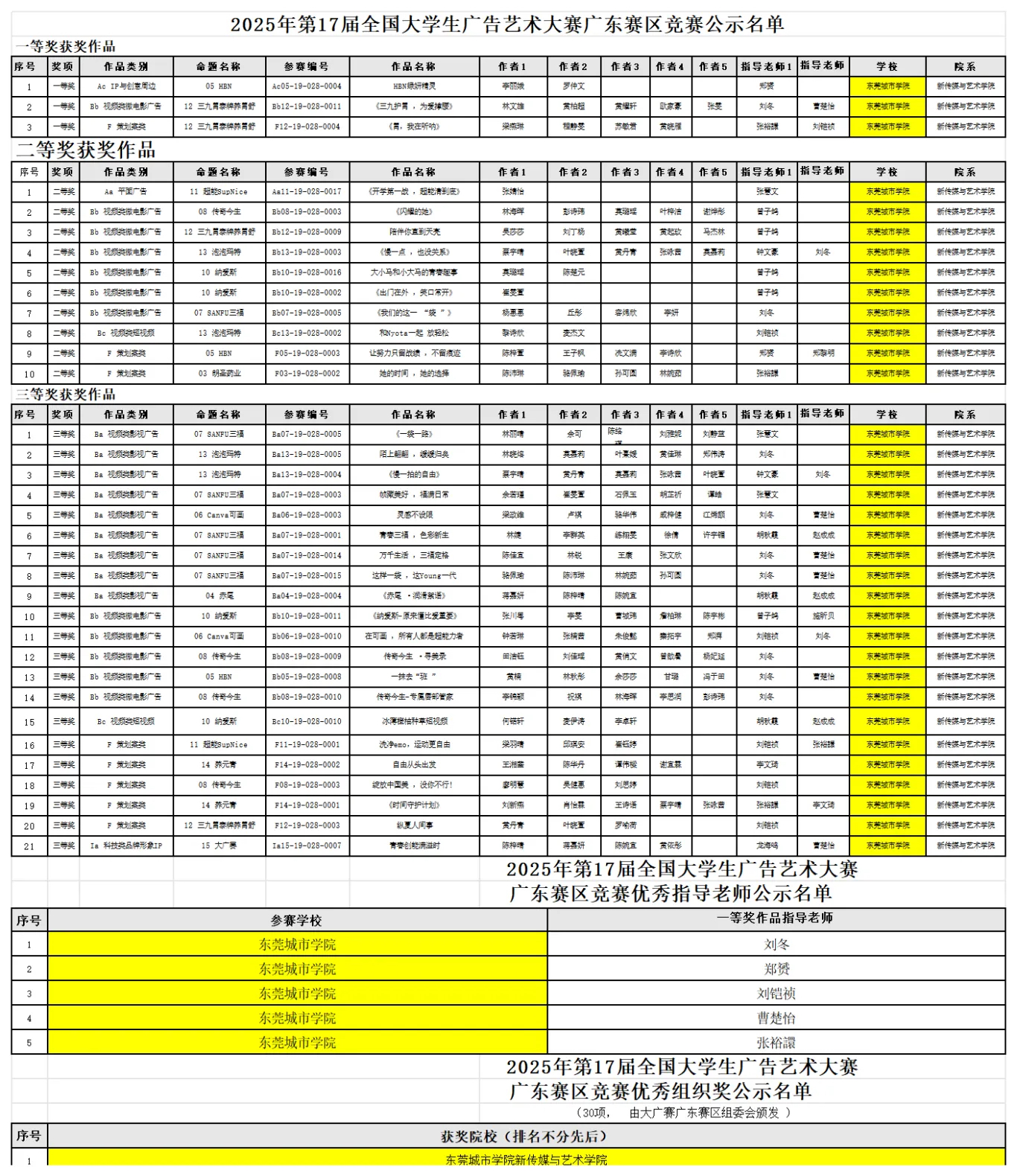 在众多奖项中,新传媒与艺术学院更是凭借优异的组织与指导工作,荣获广东赛区竞赛优秀组织奖,该奖项全省仅30所高校获得,充分彰显了学院在组织学生参与竞赛方面的专业度与高效性。同时,学院的5位教师刘冬、郑赟、刘铠祯、曹楚怡、张裕譞,凭借对学生的悉心指导和对竞赛的卓越贡献,将广东赛区竞赛优秀指导老师荣誉收入囊中。