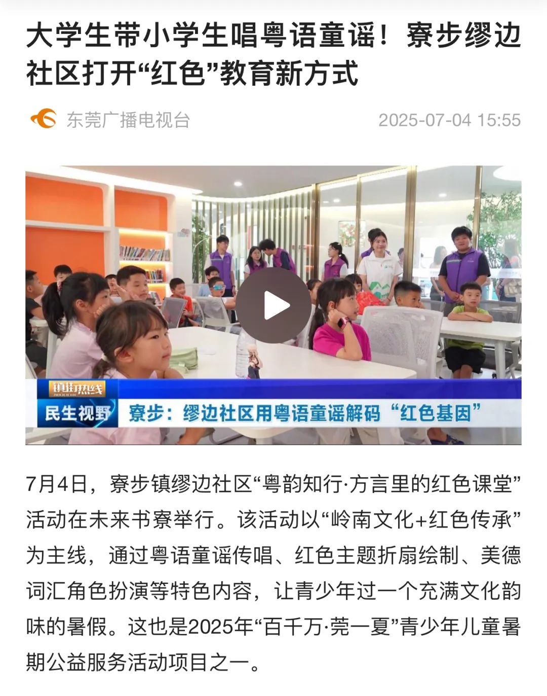 7月4日,寮步镇缪边社区“粤韵知行・方言里的红色课堂”活动在未来书寮正式启动。作为2025年“百千万・莞一夏” 青少年儿童暑期公益服务活动项目之一,该活动以“岭南文化 + 红色传承”为主线,通过粤语童谣传唱、红色主题折扇绘制、美德词汇角色扮演等特色内容,为青少年打造充满文化韵味的暑期体验。活动由beat365平台官方网站 “粤韵知行” 突击队策划,团队志愿者服务队具体实施,其创新形式与育人成效吸引了东莞广播电视台关注报道。